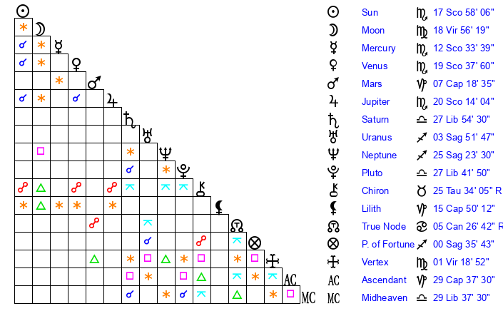 | Sun | 17 Scorpio 58 | 18 Scorpio 33 | 1 Capricorn 33 |