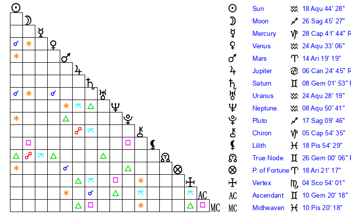Sun | 18 Aquarius 45 | 19 Aquarius 10 | 11 Pisces 56 |