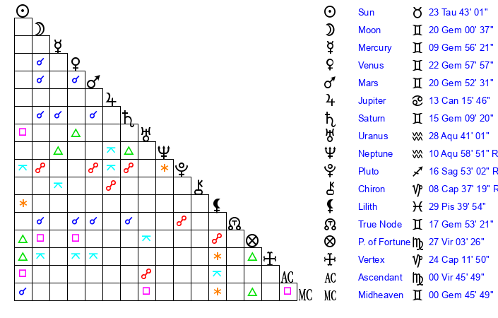 Venus | 22 Gemini 59 | 9 Aries 36 | 20 Cancer 26 |