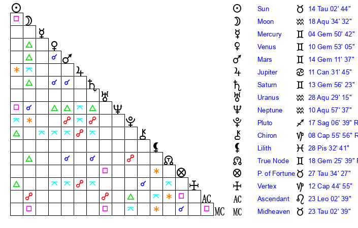 Sun | 14 Taurus 3 | 14 Taurus 29 | 6 Gemini 14 |