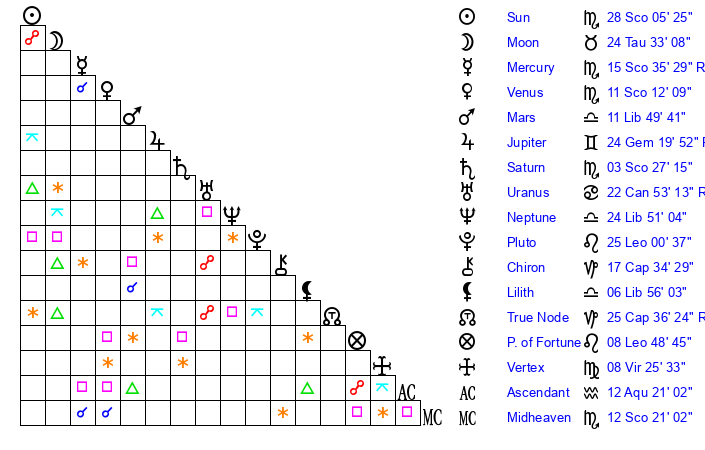 | Sun | 28 Scorpio 5 | 28 Scorpio 37 | 11 Aquarius 18 |
