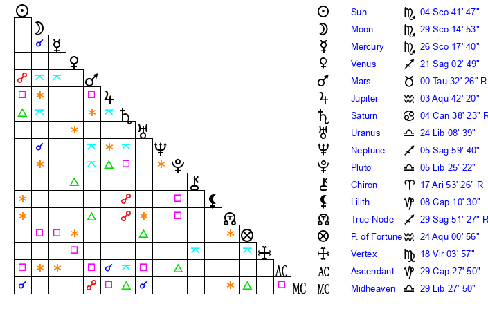 | Moon | 29 Scorpio 14 | 18 Capricorn 59 | 27 Libra 44 |