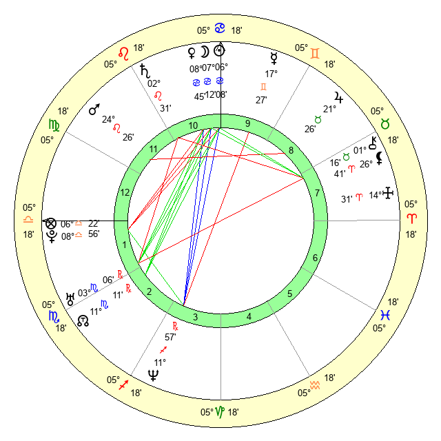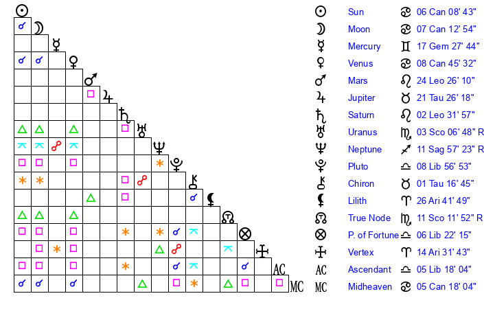 | Moon | 7 Cancer 19 | 6 Leo 16 | 27 Aries 59 |