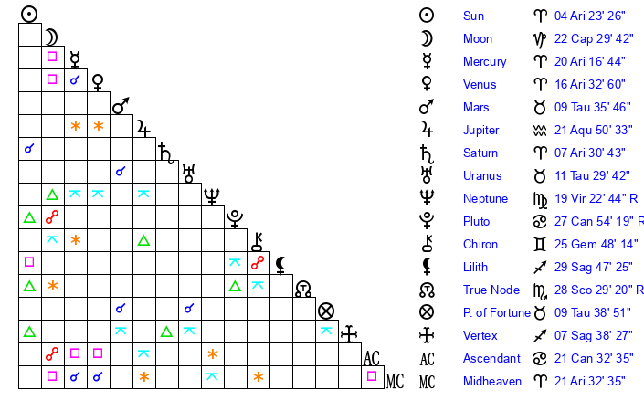| Moon | 22 Capricorn 17 | 14 Aquarius 24 | 24 Pisces 8 |