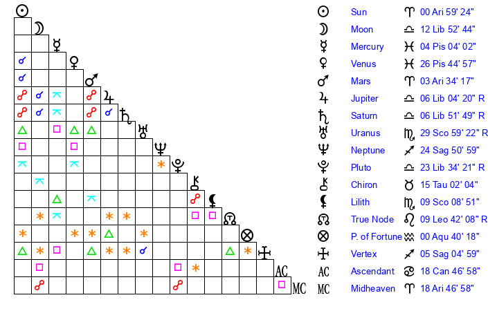 | Moon | 12 Libra 46 | 22 Sagittarius 20 | 21 Taurus 42 |