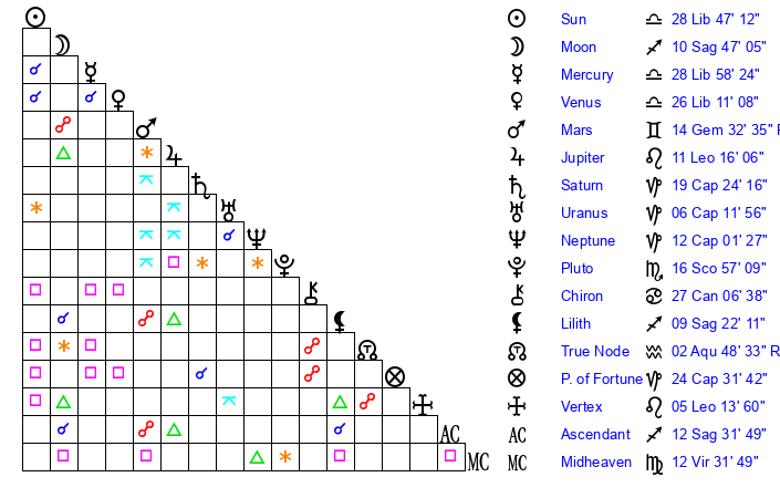 | Mercury | 28 Libra 58 | 21 Scorpio 57 | 22 Sagittarius 39 |