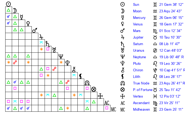 | Sun | 21 Gemini 38 | 21 Gemini 58 | 1 Virgo 26 |