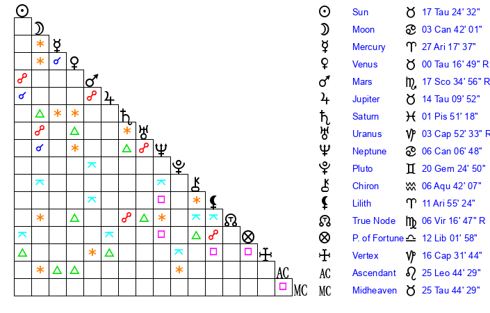 | Sun | 17 Taurus 25 | 18 Taurus 21 | 12 Virgo 26 |