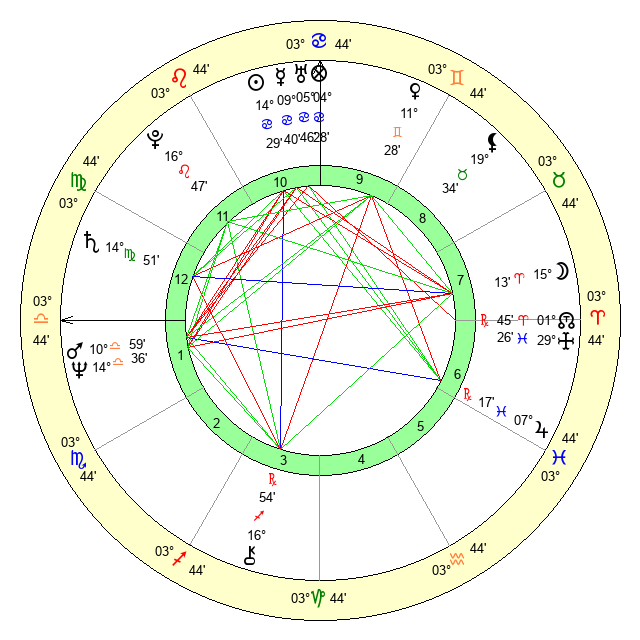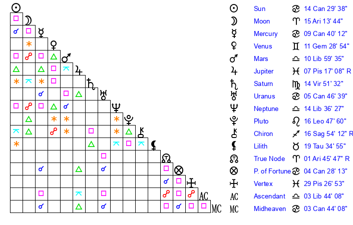 | Sun | 14 Cancer 29 | 15 Cancer 20 | 26 Virgo 39 |