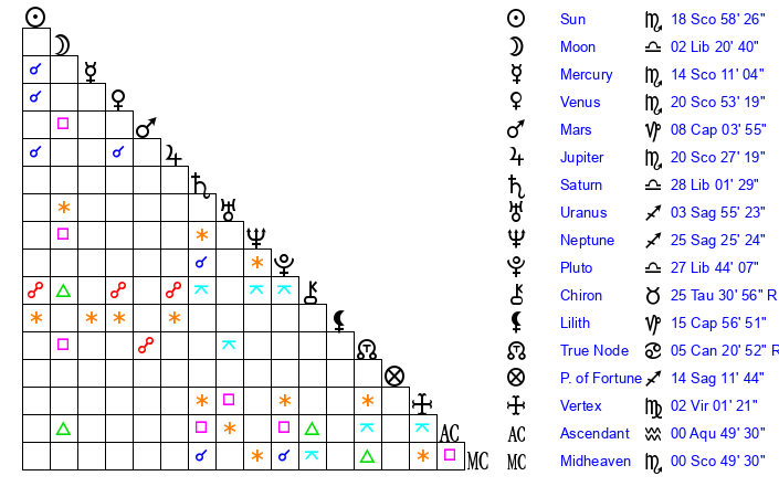 | Sun | 18 Scorpio 59 | 19 Scorpio 33 | 2 Capricorn 34 |