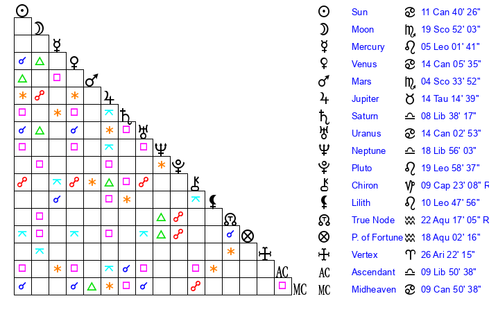 | Moon | 19 Scorpio 45 | 21 Libra 52 | 1 Leo 43 |