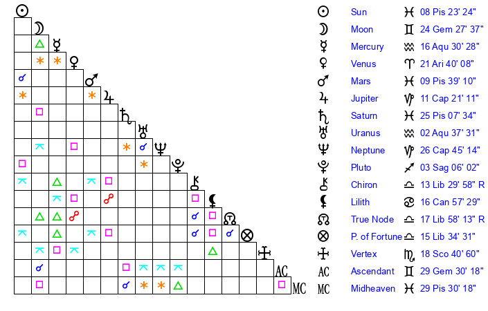 | Mercury | 16 Aquarius 30 | 24 Pisces 8 | 6 Aries 41 |