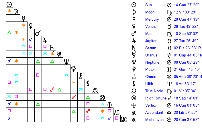 | Moon | 12 Virgo 7 | 4 Sagittarius 16 | 13 Aquarius 43 |