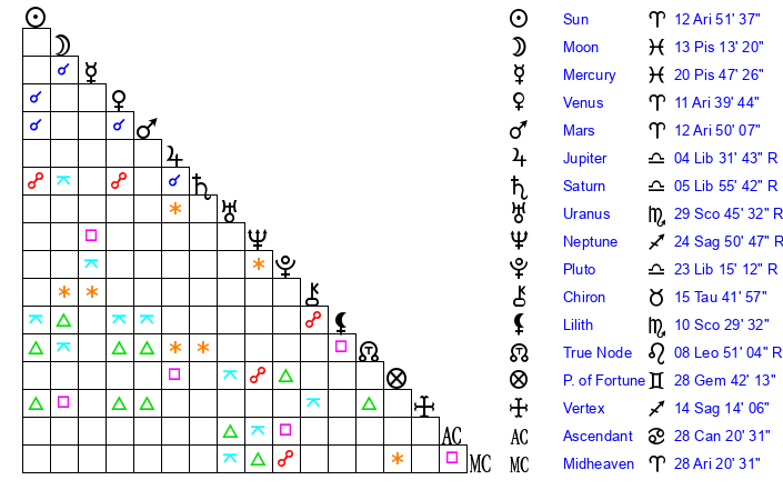 | Saturn | 6 Libra 21 | 24 Pisces 37 | 3 Libra 44 |