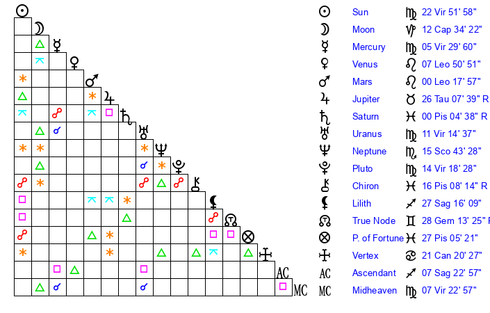 | Pluto | 14 Virgo 19 | 1 Aquarius 32 | 16 Virgo 3 |