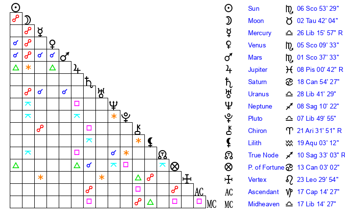 | Moon | 2 Taurus 44 | 19 Aquarius 41 | 16 Pisces 13 |