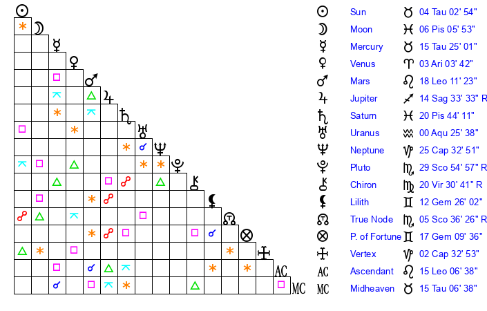 | Sun | 4 Taurus 3 | 4 Taurus 46 | 3 Gemini 3 |