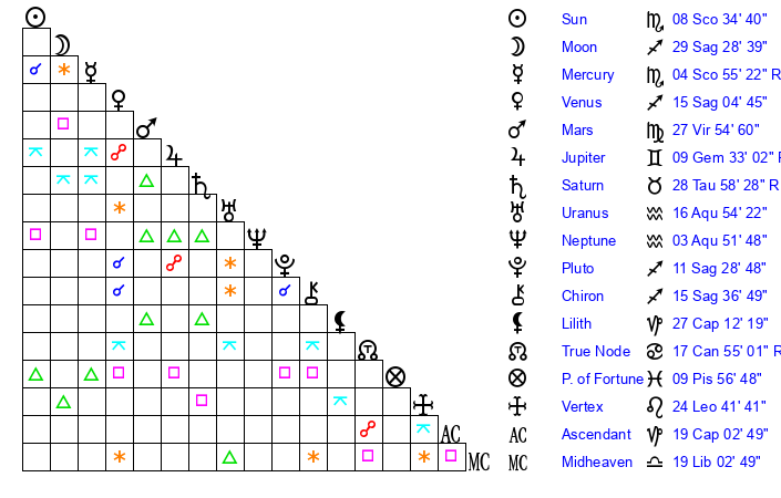 Sun | 8 Scorpio 35 | 8 Scorpio 46 | 2 Sagittarius 44 |
