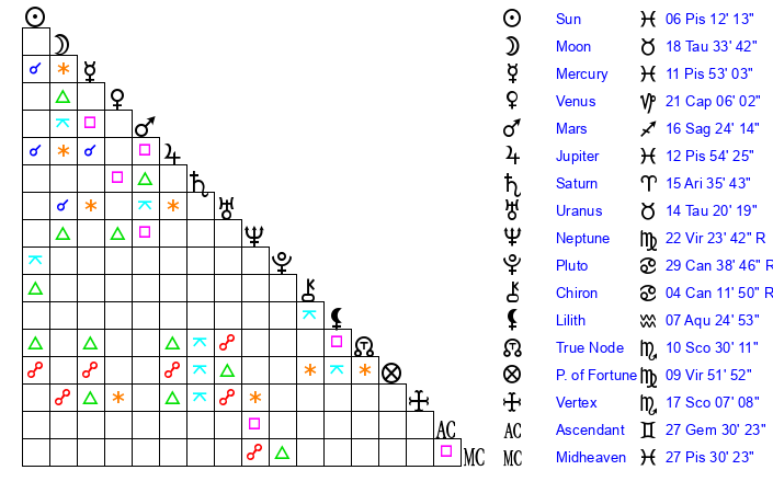 | Sun | 6 Pisces 12 | 7 Pisces 20 | 0 Gemini 41 |