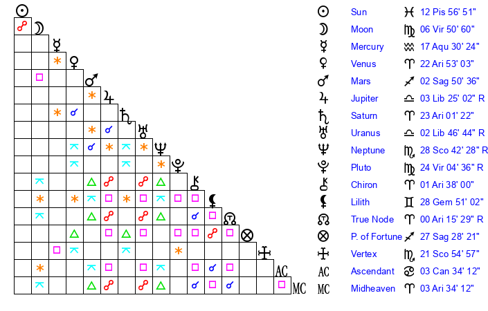 Saturn | 23 Aries 13 | 20 Pisces 57 | 0 Taurus 2 |