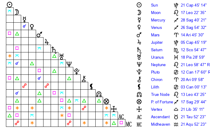 | Neptune | 21 Leo 58 | 27 Pisces 29 | 19 Leo 48 |