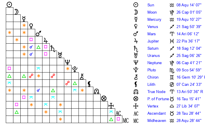 | Sun | 8 Aquarius 14 | 9 Aquarius 2 | 16 Pisces 35 |