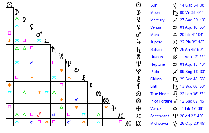 | Neptune | 1 Aquarius 13 | 29 Pisces 34 | 2 Aquarius 14 |