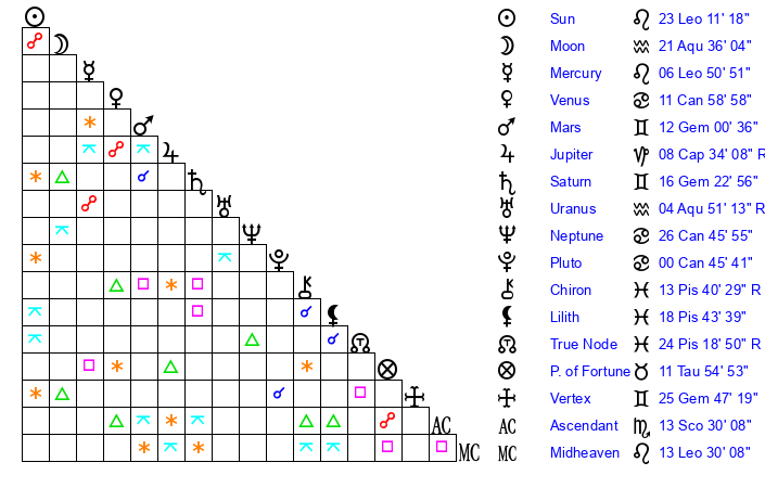 | Moon | 21 Aquarius 32 | 0 Gemini 28 | 25 Pisces 45 |
