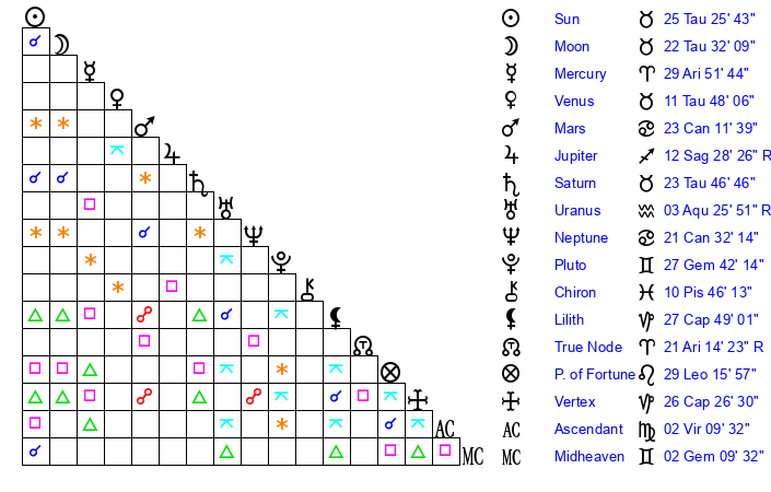 | Saturn | 24 Taurus 21 | 29 Pisces 13 | 4 Gemini 40 |