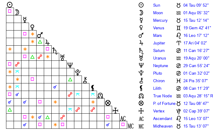 Uranus | 19 Aquarius 17 | 25 Taurus 59 | 17 Aquarius 37 |