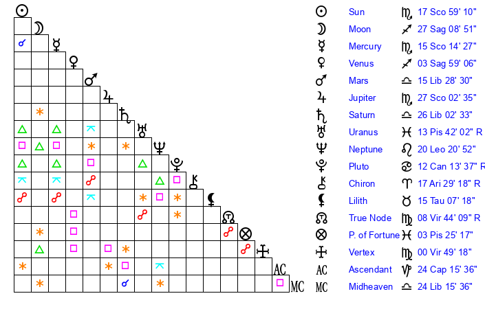 | Jupiter | 26 Scorpio 51 | 25 Cancer 10 | 16 Sagittarius 44 |