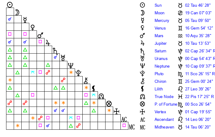 Moon | 19 Cancer 11 | 22 Aquarius 59 | 16 Scorpio 40 |