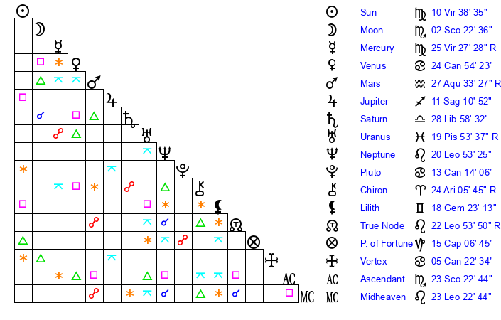 | Venus | 24 Cancer 54 | 10 Leo 31 | 19 Scorpio 38 |