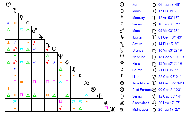 Moon | 16 Pisces 53 | 2 Taurus 26 | 26 Taurus 47 |