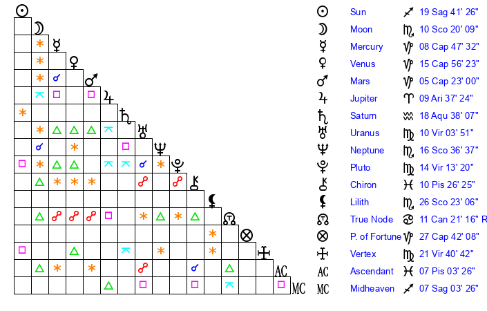 Moon | 10 Scorpio 19 | 11 Taurus 43 | 27 Capricorn 2 |