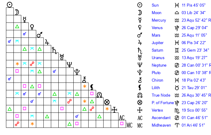 | Mercury | 23 Aquarius 52 | 0 Aries 3 | 7 Cancer 37 |