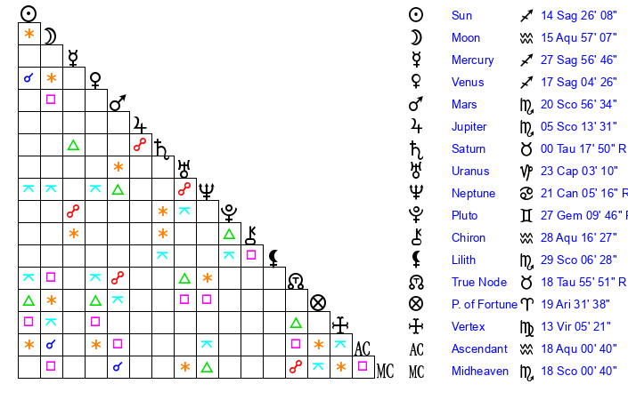 | Moon | 15 Aquarius 59 | 19 Cancer 43 | 5 Taurus 52 |