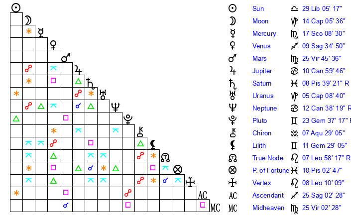 | Moon | 13 Capricorn 58 | 20 Scorpio 58 | 21 Taurus 7 |