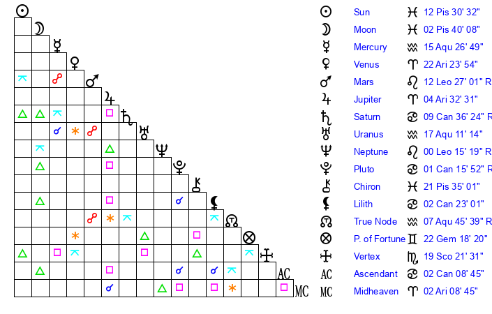 | Moon | 2 Pisces 45 | 29 Aries 31 | 1 Pisces 21 |