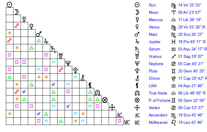 | Sun | 14 Virgo 34 | 16 Virgo 0 | 16 Capricorn 43 |