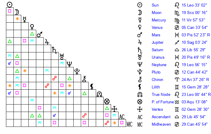 | Neptune | 19 Leo 56 | 1 Aries 51 | 22 Leo 34 |