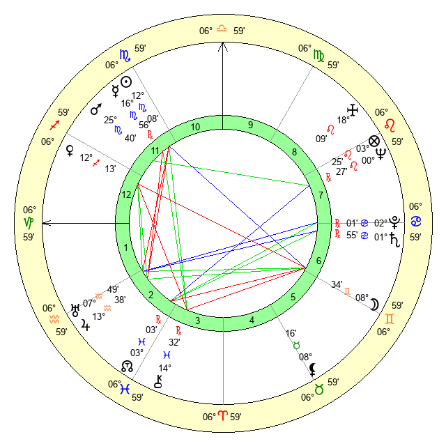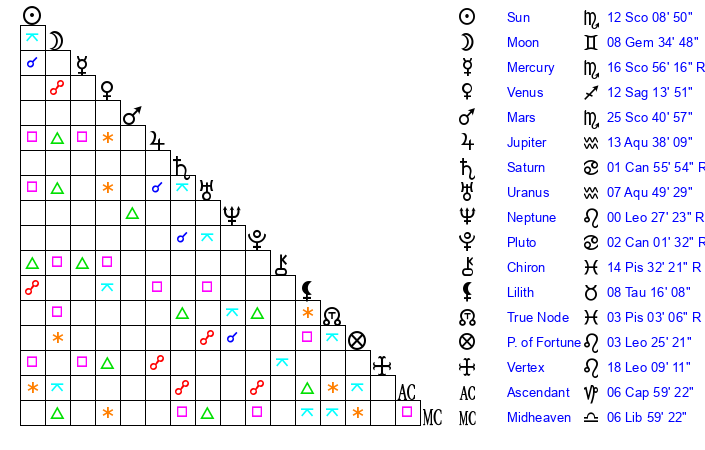 | Sun | 12 Scorpio 9 | 13 Scorpio 14 | 4 Pisces 43 |