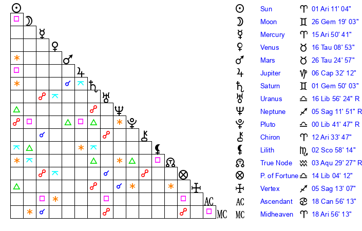 Moon | 26 Gemini 21 | 22 Sagittarius 20 | 0 Gemini 39 |