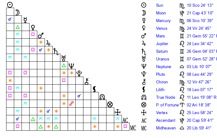 | Sun | 10 Scorpio 24 | 11 Scorpio 46 | 2 Aquarius 35 |