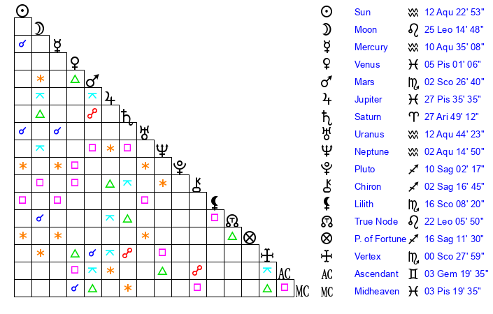 | Sun | 12 Aquarius 23 | 13 Aquarius 5 | 8 Pisces 39 |