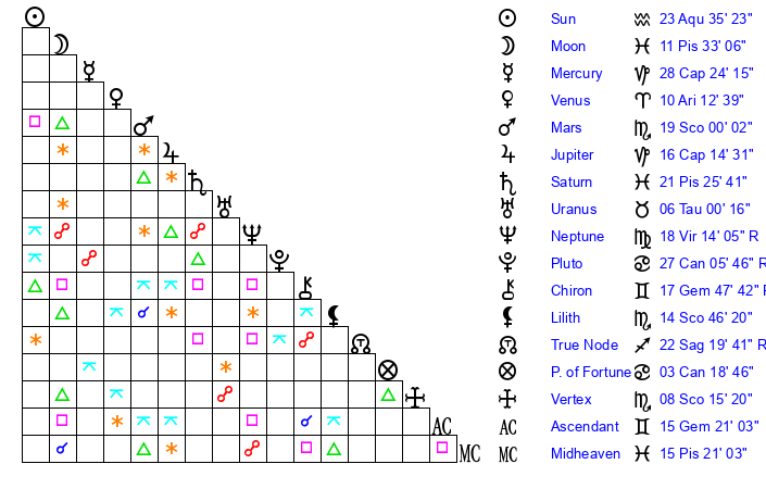 | Sun | 23 Aquarius 35 | 24 Aquarius 14 | 20 Taurus 34 |
