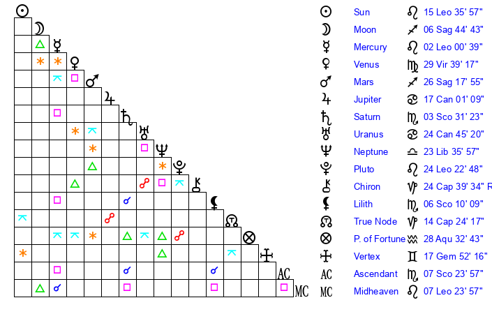 | Pluto | 24 Leo 23 | 2 Aquarius 14 | 26 Leo 23 |