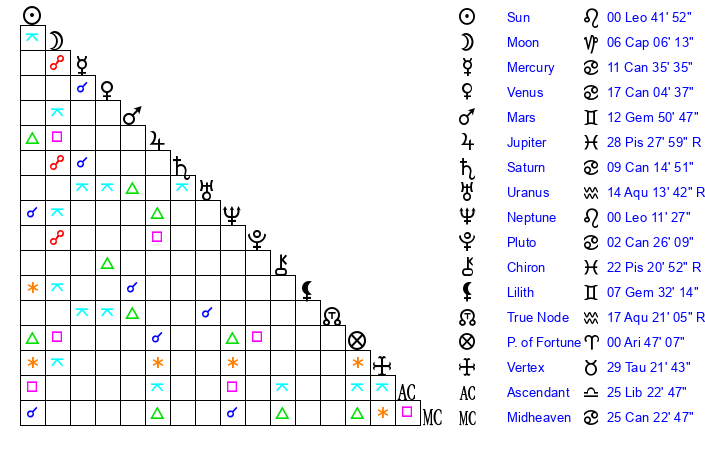 | Sun | 0 Leo 41 | 2 Leo 3 | 18 Scorpio 13 |