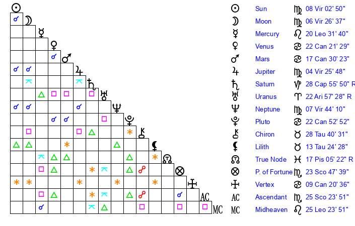 | Neptune | 7 Virgo 44 | 1 Aries 21 | 10 Virgo 9 |