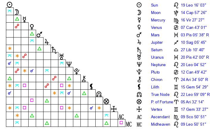 Moon | 14 Capricorn 56 | 27 Pisces 51 | 16 Virgo 48 |